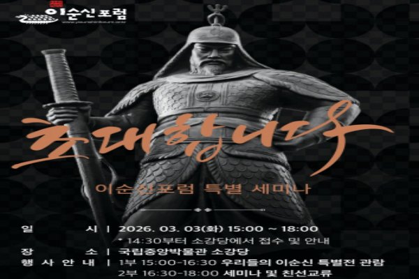 저희 이순신포럼에서는 제6대 조문수 이사장 취임을 기념하여 3월 3일 오후 3시에 국립중앙박물관에서 이순신포럼 특별 세미나를 개최합니다.